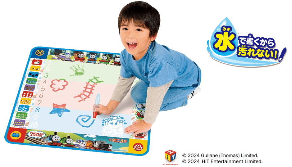 「スイスイおえかき」シリーズに新しく「きかんしゃトーマス3カラーおえかき&すうじ」が登場しました。お水のペンで書くので汚れることもなく、乾くと消えるので繰り返しおえかきが楽しめます。シートのトーマスをなぞると、トーマスが出現。イラストの数字をなぞり書きすることで、数字覚えができます。人間工学に基づいた形状の持ちやすいペンを付属。くぼみに親指がくるように持つことでおえかきしながら正しいペンの持ち方を身に付きます。トーマスとなかまたちと一緒に楽しくおえかきしてみてくださいね。