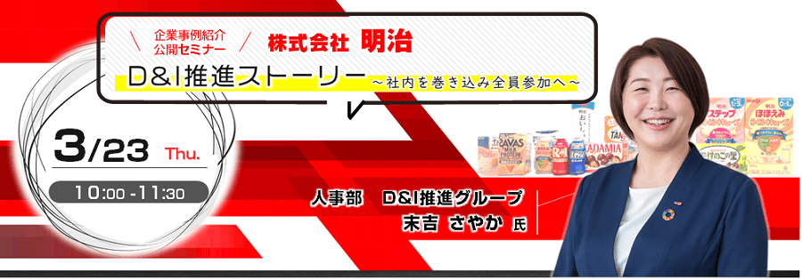 先進企業の事例紹介「株式会社明治 D&I推進ストーリー ~社内を巻き込み、全員参加へ~」 公開セミナー 3月23日(木)開催