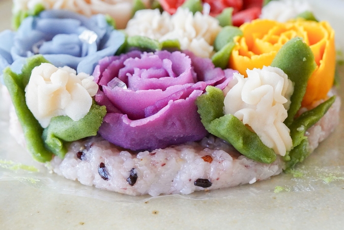 横から見てみると、お花の下に18雑穀米入りのもち米がチラリ。見た目だけでなく健康も意識できるのが嬉しいポイントです。
