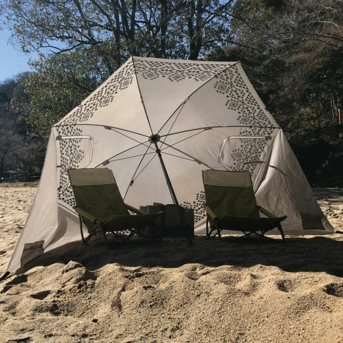 本格的なタープやテントよりも気軽に使え、傘のようにパッと開くだけの簡単タープ。女性1人でも簡単に設営できるタイプです。