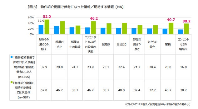 物件紹介動画について、参考にしたと答えた人に「参考になった情報」、Z世代全体に「期待する情報」を聞きました。1位はいずれも「駅からの道のりの様子」(参考になった:32.9%、期待:52.0%)となり、多くの人が知りたい情報であることが分かります。「参考になった情報」では、3位に「部屋の中の動線」(24.7%)が挙がり、具体的な部屋の中の様子が参考になった人が多いようです。一方、「期待する情報」では、2位に「エアコンやトイレなどの設備の状態」(46.2%)、4位に「家賃」(40.7%)、7位に「コンセントなどの場所」(38.2%)が挙がっており、Z世代のリアルな視点が浮き彫りになりました[図8]。