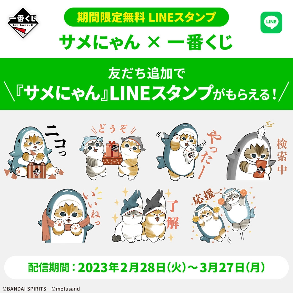 一番くじLINE公式アカウントを「友だち追加」すれば、2023年2月28日(火)~2023年3月27日(月)の期間限定で、『サメにゃん × 一番くじ』LINEスタンプを無料でダウンロードいただけます。