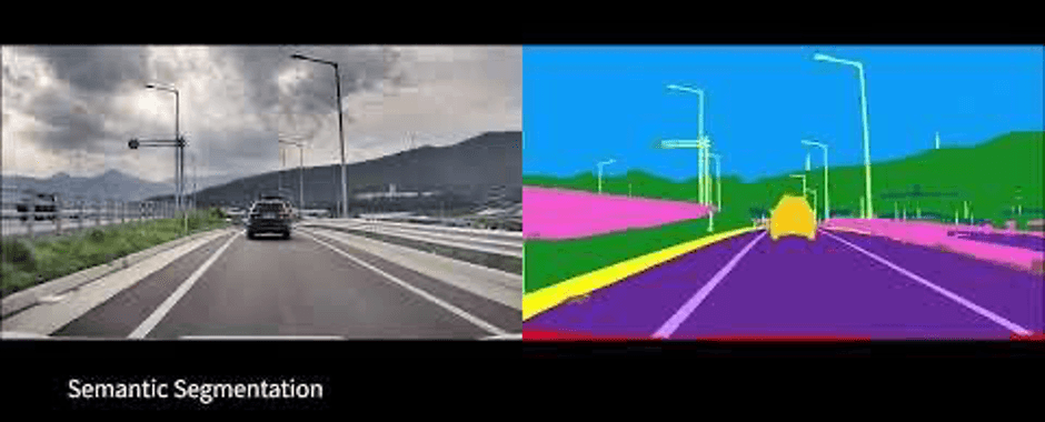 セマンティックセグメンテーション:車両のカメラで取得した画像を、ディープラーニング技術によりピクセル単位で解析し、対象物を分類します。