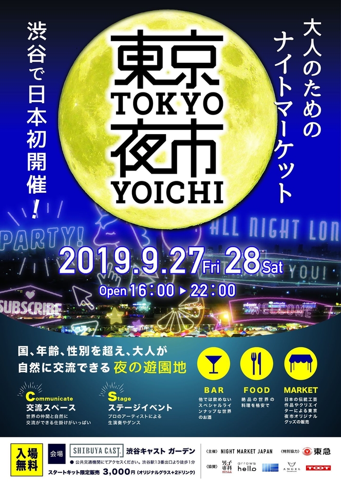 株式会社 NIGHT MARKET JAPAN(所在地:東京都渋谷区、代表取締役:赤池 慶彦)は2019年9月27日(金)、28日(土)に、日本初の本格的ナイトマーケット、「TOKYO NIGHT MARKET」を渋谷キャスト ガーデン(東京都渋谷区渋谷1-23-21)で開催することをお知らせ致します。