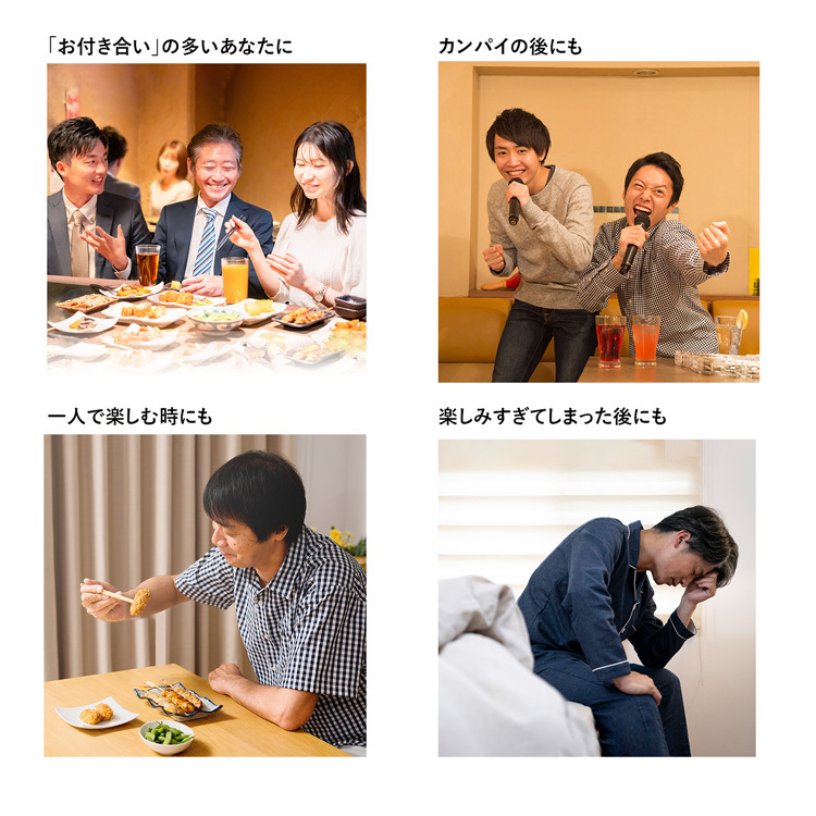 会食が多く、かつ体力に衰え、肝臓に負担がかかりやすくなってきた40~60代男性をメインターゲット層として肝臓の働きをサポートする成分を配合し、栄養不良に伴う二日酔いのだるさを改善することを狙い、「飲む前、後にも」使用できるドリンクタイプと錠剤タイプの商品開発をいたしました。