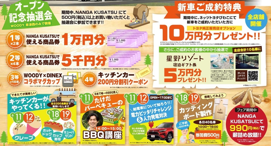 ネッツトヨタびわこ「WOODY草津西店」&「NANGA KUSATSU」 6月11日(土)からグランドオープンフェア開催