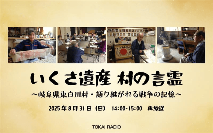 TOKAI RADIOが2015年に制作・放送した、岐阜県加茂郡東白川村の戦争体験を伝えるドキュメンタリー「いくさ遺産 村の言霊~岐阜県東白川村・語り継がれる戦争の記憶~」の再放送が決まった。戦争を経験した村人の生の声を通じ平和の尊さを伝え、大きな反響を呼んだ番組を、8月31日(日)14時00分から再放送する。