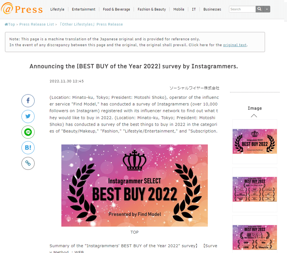 今後の展開では、英語・中国語圏で運営されているネットメディアとの提携により、翻訳されたプレスリリースの転載を進めることで、より多くの対象市場の生活者へ情報を伝播していく仕組みの構築を計画しております。