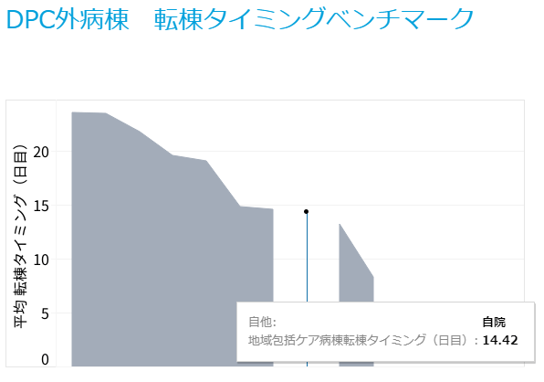 例えば、脳疾患の患者について、自病院と他病院の転棟タイミングを比較して、大きな開きがあれば、転棟タイミングを見直し、医療の質向上や経営の効率化を促すというようなことができるようになります。