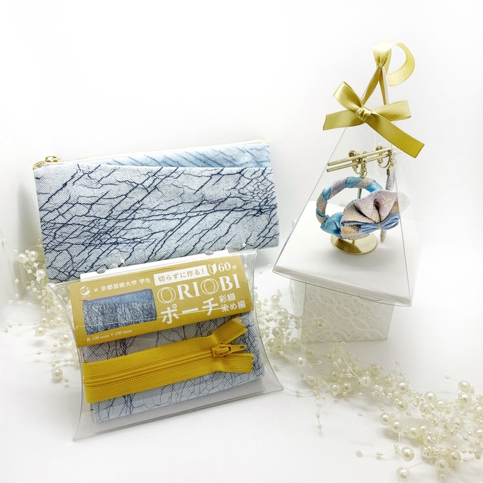 ORIOBIでは、京都芸術大学の学生3名とミーティングや試作を重ね完成したコラボ新製品「切らずに作る!ORIOBIポーチ-彩纈染め編-」と、芸大生がデザインした新しいパッケージの「ORIOBI」ミニチュアアクセサリーを期間中に限定販売します。