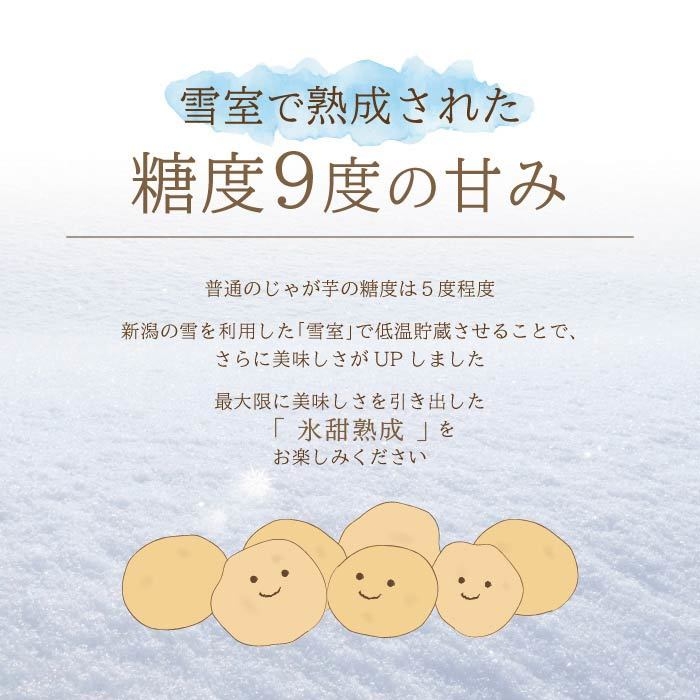 新潟県はご存知のように国内でも積雪量が多い地域です。この気候を活かし、『氷甜熟成(ひょうてんじゅくせい)』することによってじゃが芋のポテンシャルを最大限に引き出すことで果物のように甘く、コク深いじゃが芋を皆様へお届けしたいという思いからプロジェクトを開始いたしました。