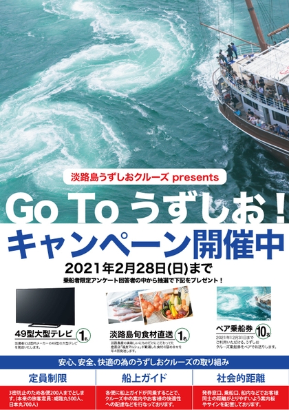 兵庫県・淡路島・道の駅福良(ふくら)から出航している「うずしおクルーズ」(運営:ジョイポート南淡路株式会社、代表取締役:鎌田勝義)は2021年1月1日(金)~2021年2月28日(日)の期間、乗船者限定アンケートにお答え頂いた方の中から抽選で、49型テレビ、淡路島の幸セット(年間4回発送)、うずしおクルーズ招待券をプレゼントする「Go To うずしお キャンペーン第2弾」を実施いたします。さらに、期間中に乗船いただいたお客様全員に「使い捨てカイロ」を無料でプレゼントいたします。乗船するお客様の寒さを軽減できればと思っております。