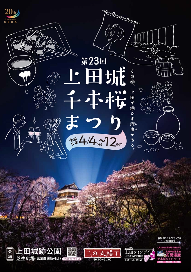 上田城跡公園芝生広場(児童遊園地付近)では、地元上田市の食材を使った春の味覚と地域の魅力が一堂に集う「二の丸横丁」を開催します。昼は春の味覚を楽しめる賑わいの広場として、夜はライトアップされた幻想的な夜桜とともに、ゆったりとした花見のひとときをお過ごしいただけます。