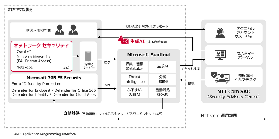 本サービスは、「Microsoft 365 E5 Security※2」のログを「Microsoft Sentinel」に転送し、ログ蓄積、ログ分析、アラート自動対処の機能を提供してきましたが、このたび、Zscaler, Inc.、Palo Alto Networks、Netskopeなどの提供するネットワークセキュリティ製品のログ※3に対応します。また、生成AIを活用したわかりやすい日本語アラート通知機能を実装するなど、新機能を提供開始します。