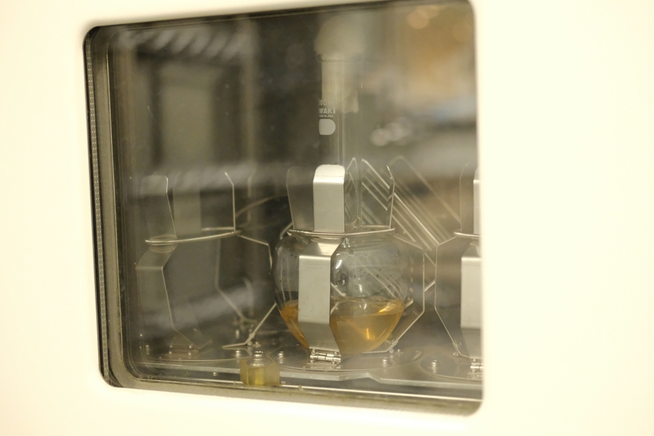 古くから日本の暮らしに活用されてきた植物に着目し、スキンケアなどに生かすため研究開発を積み重ねてきた北麓草水。ディープモイストタイプに新たに配合したモモ果汁発酵液*は、発酵技術を用い、3年の歳月をかけて自社開発した独自の美肌成分です。原料は、北麓草水の工場がある、山梨県特産の桃。収穫までの過程で、キズや過熟のために青果として出荷できないものを使用しています。丸ごと粉砕した桃を搾汁機で搾り、採れた果汁にリポミセスという酵母菌を接種し、培養を繰り返してつくります。発酵の第1段階としてフラスコ培養を行ない、正常に培養できているかを確認しながら、3度のスケールアップを経て、約2週間かけて完成したモモ果汁発酵液は、北麓草水独自の保湿成分です。モモ果汁発酵液は、優れた保湿力が特長の多糖類を多く含み、角質層の水分量を高めて、肌のキメを整える効果があることがわかっています。
