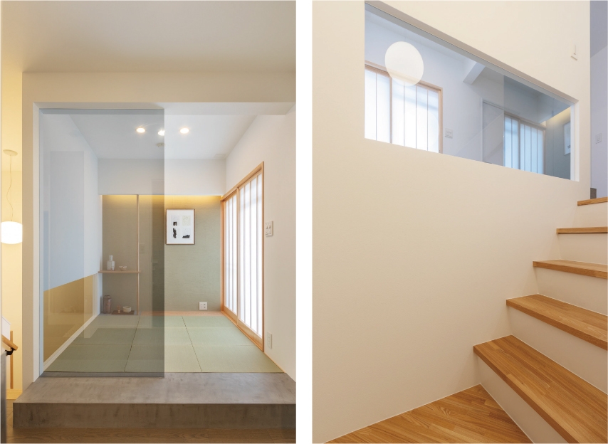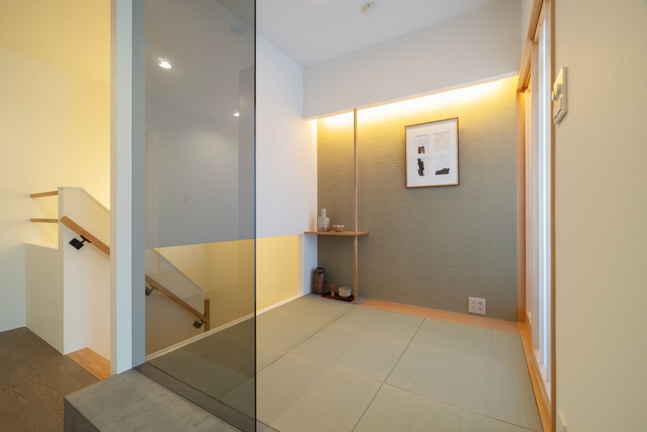玄関正面にレイアウトした「茶室」がこの物件のシンボル。茶室の基本である畳・塗壁・床の間の要素に、ガラスとブラックモールテックスをプラスしてモダンに仕上げました。日本建築の美しさを日常に取り入れ、より上質な暮らしを創り出します。