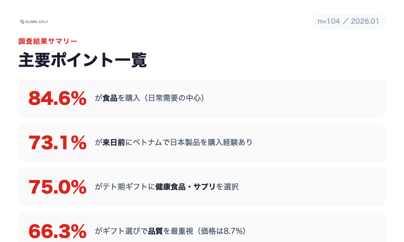 株式会社グローバル・デイリー(本社所在地:東京都台東区、代表取締役:荒井良治)は、日本在住のベトナム人を対象に、「在留ベトナム人の日本製品の利用実態と、テト(Tet/ベトナムの旧正月。2026年は2月17日(火)。前後の土日を含め長期休暇となる場合がある)・長期休暇シーズンに家族や友人に贈りたい日本ギフト」に関する調査を実施しました。
