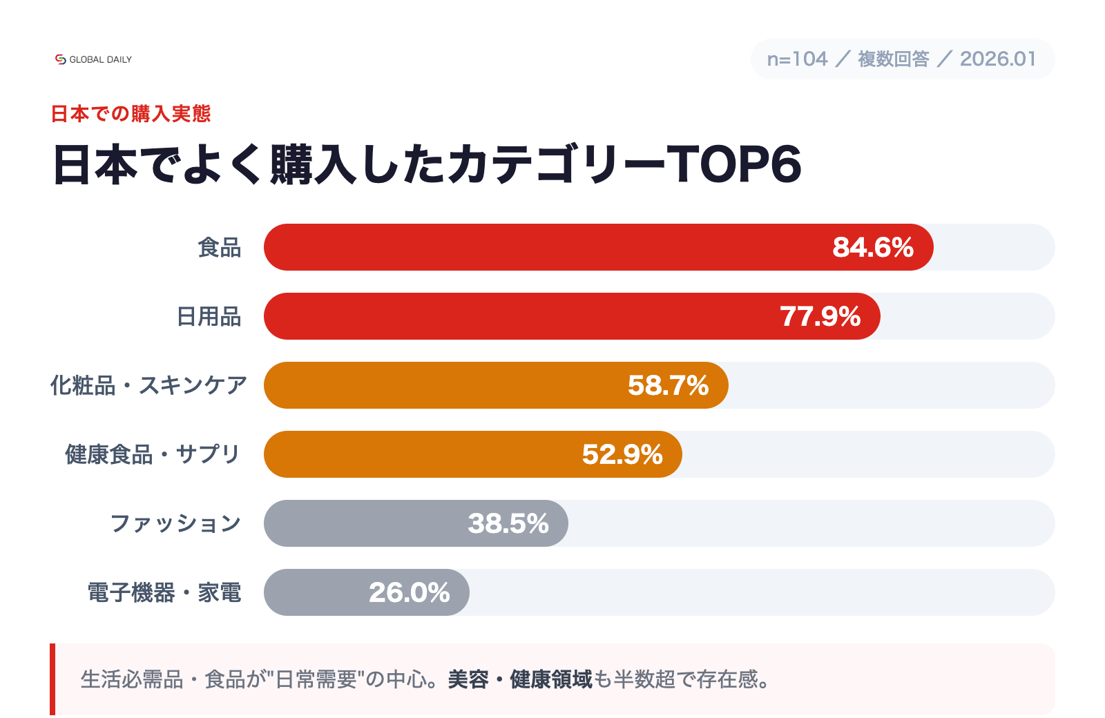 - 日本でよく購入するカテゴリーは「食品(インスタント食品・スナック・飲料など)」84.6%、「日用品(洗剤・クリーナー・シャンプーなど)」77.9%が上位。生活必需品・食の“日常需要”が中心。
