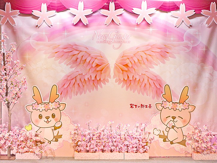 スライスした岩下の新生姜を200枚並べて4枚の羽を表現したフォトスポット「岩下の新生姜ウイング」を桜いっぱいにデコレーション。桜の妖精になりきって写真撮影をお楽しみいただけます。