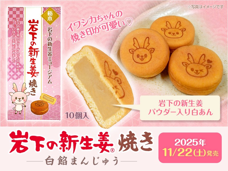 イワシカちゃんの焼き印がかわいい♪「岩下の新生姜焼き-白餡まんじゅう-」新発売。~ほんのり生姜風味の白餡をカステラ生地で包みました~