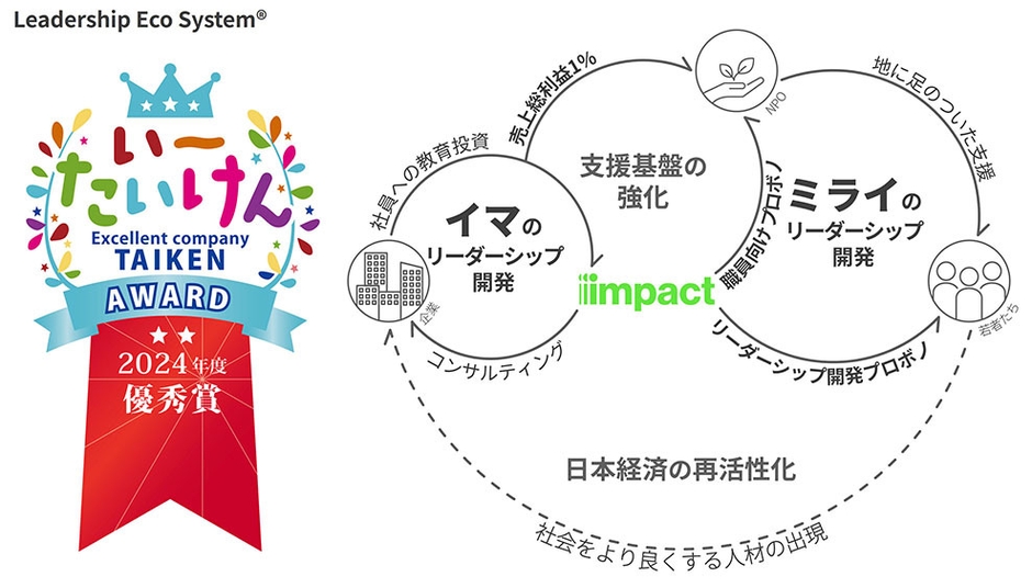 組織・人材開発研修、コンサルティングを提供するインパクトジャパン株式会社(本社:中央区築地、代表取締役社長:戒能 祥哲、以下、当社)は、文部科学省主催の令和6年度「いーたいけんアワード(青少年の体験活動推進企業表彰)」において、リーダーシップ・エコシステム(R)の取り組みにて、優秀賞を受賞しました。今後もリーダーシップ開発を本業とする当社ならではの社会課題への取り組みとして、本活動を継続していきます。