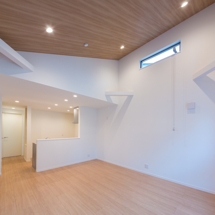 勾配天井を配したリビング空間には上部からも陽の光が差し込み、室内が広く明るい雰囲気に包まれます。