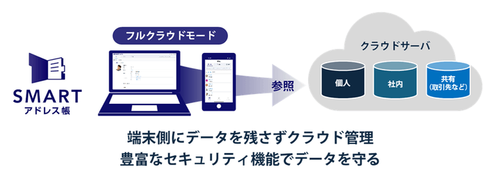 従来は、端末上のアプリとクラウド上の連絡先データを同期する形でご利用いただいておりますが、今回リリースしたフルクラウドモードは、この同期作業が不要となりクラウド上でデータ管理が完結します。これにより、端末紛失時の情報漏洩リスクを大幅に低減するとともに、登録可能なデータ数が拡大し、大規模な組織での利用にも柔軟に対応可能となります。