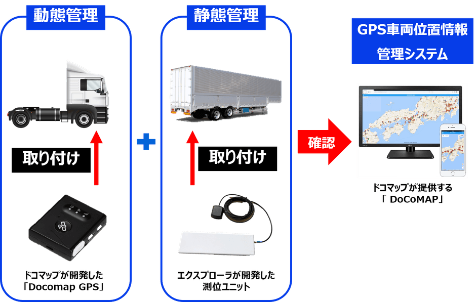 「docomap Trailer」は、株式会社ドコマップジャパン(以下 ドコマップ)が開発した、GPS端末を車両に取り付けて車両の位置情報がシステムに記録される仕組みである「Docomap GPS」と、PALTEKのグループ会社である株式会社エクスプローラ(以下 エクスプローラ)が開発した、準天頂衛星システム「みちびき」のサブメートル級の測位補強サービス(以下 SLAS)を活用したトレーラシャーシなど車両の静態管理ができる測位ユニットを、ドコマップが提供する「DoCoMAP」上で確認できるサービスです。