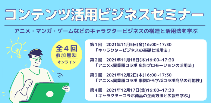 第2回は、「アニメ×異業種コラボ 広告プロモーションの活用法」をテーマに、11月18日(木)に開催します。また、第3回、第4回の日程も決定しましたので、以下のとおりご案内します。