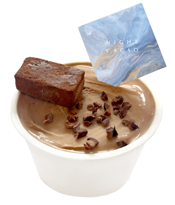 70%ダークチョコを使ったリッチな味わいのジェラートにカットした生チョコをトッピング。