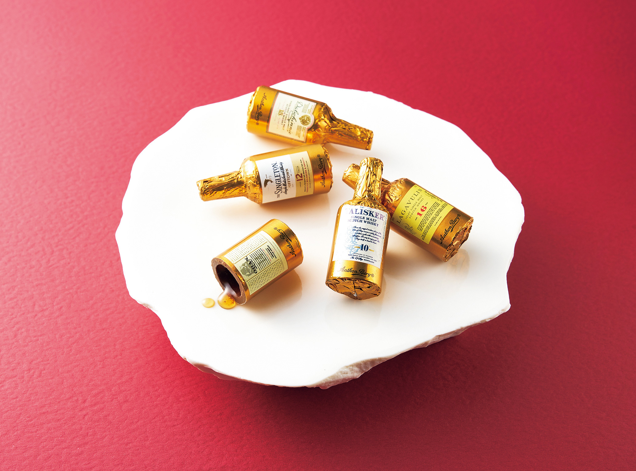 シングルトン、ダルウィニー、オーバン、タリスカー、ラガヴーリン。世界的に有名なウイスキー5種をダークチョコに閉じ込めました。