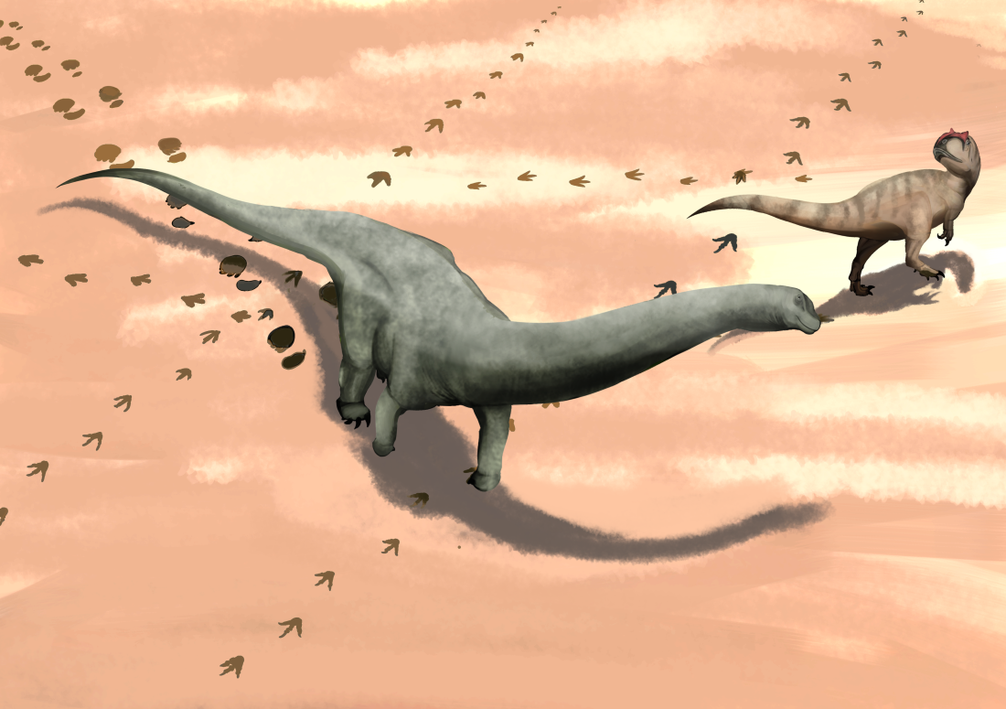 竜脚類の2頭はほぼ同じ大きさ(後ろ足跡の長さ約70cm)で、2頭の足跡がほぼ重なるようについていました。この事から1頭が歩いた跡、その同じところをもう1頭が少し遅い速度で通ったことが復元されました。このように先に動物が歩いた跡を別の個体がたどる例はゾウなどでも確認されています。