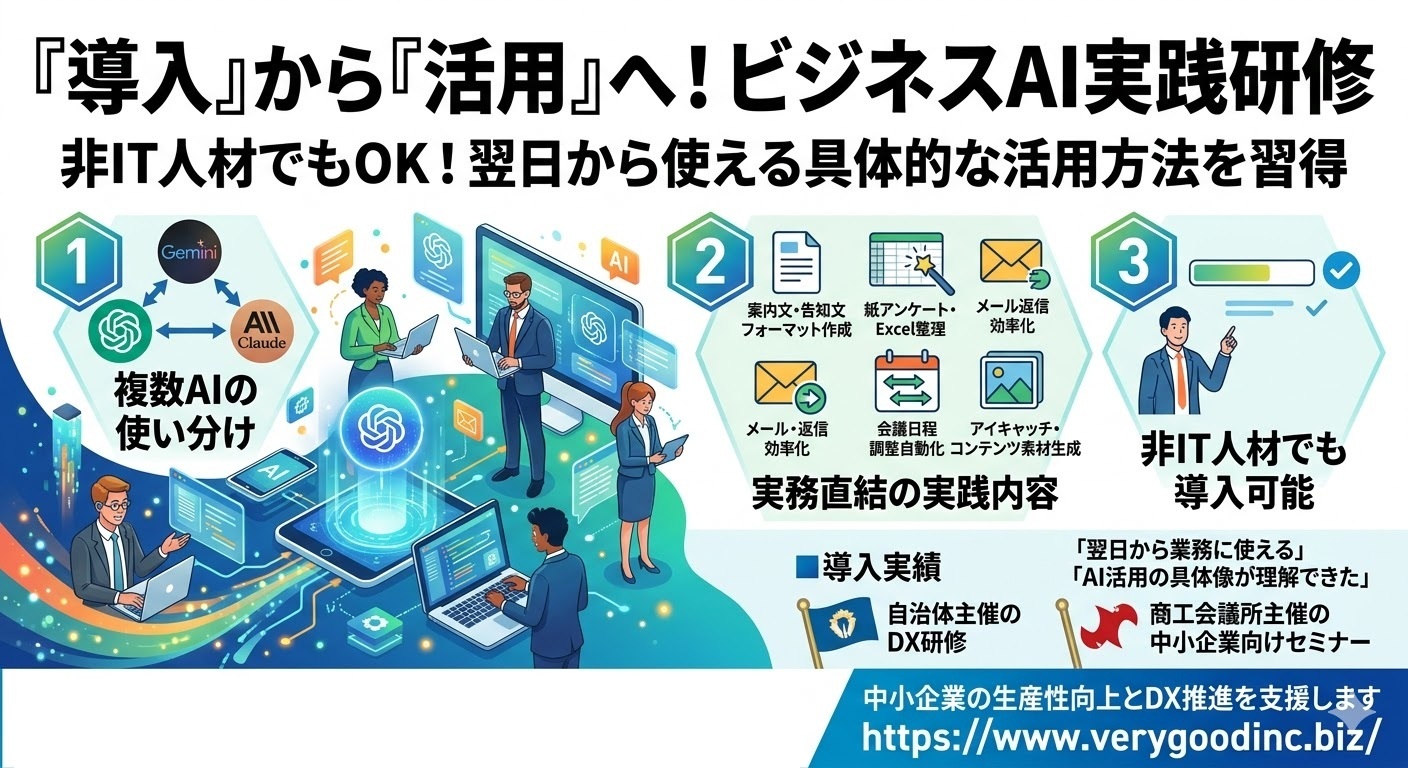 株式会社ベリーグッド(本社:東京都新宿区、代表取締役:堀内 大、URL:https://www.verygoodinc.biz/)は、企業および自治体向けに、生成AIを業務に活用するための実践型研修・セミナーサービスを開始いたしました。