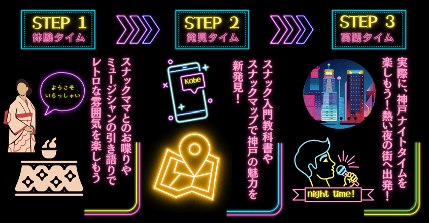 本イベントは、観光客や地元の皆様に神戸ナイトタイムの新たな楽しみ方を提案する新感覚イベントです。異国情緒漂う旧居留地中心街から会場へと足を踏み入れると、開放的なピロティホールにスナックネオンが光り輝く昭和レトロな世界が広がります。設置されたこたつやカウンターに座れば、神戸ナイトカルチャーの魅力を誰よりも知るスナックママとのトークや隣り合うお客様との出会い、エモい雰囲気にピッタリな新感覚ノンアルコールドリンクや、アーティストによる音楽パフォーマンスをお楽しみいただけます。さらに神戸のスナックエリアを紹介する「神戸スナックMAP」や、スナック初心者に向けた「スナック入門教科書」などを提供しナイトタイムの回遊を促進するなど、神戸のナイトエコノミー活性化へと繋げてまいります。