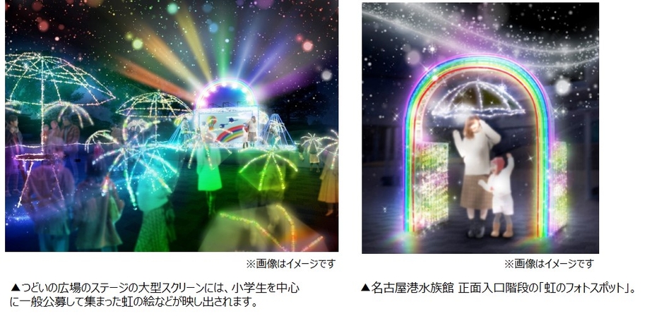 また、名古屋港水族館前には、虹のフォトスポットが登場し、周辺一帯でイルミネーションを楽しむことができます。