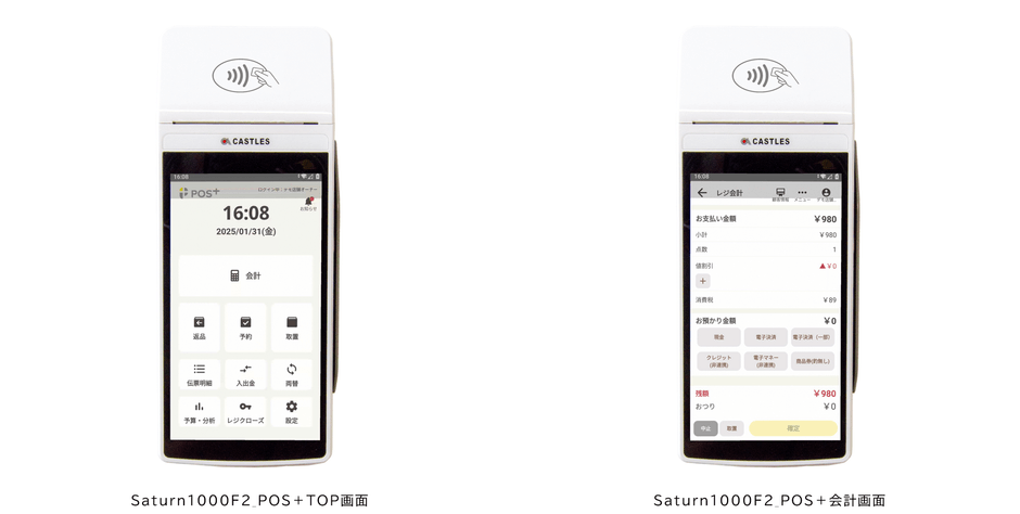 「Saturn1000F2」は、従来の決済端末と比較して大幅なスペック向上と操作性の改善を実現した最新のマルチ決済端末です。5.5インチの大型カラータッチディスプレイを搭載し、スマートフォンのような直感的な操作が可能です。持ち運びに適しているため、様々な業種・業態でご利用いただけます。今回の連携により、「Saturn1000F2」1台でキャッシュレス決済機能に加え、業務効率化や集客強化など店舗運営に役立つサービスも利用することができます。「Saturn1000F2」で「POS+」を利用することで、POSシステムと決済端末の両方の役割を果たすことができ、別々の端末を用意する必要がなくなります。これにより、レジ周りの省スペース化やデバイスの管理負荷を軽減し、店舗運営の効率化を実現します。