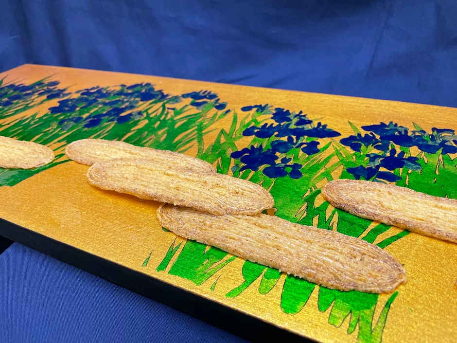 尾形光琳の「燕子花図屏風」のオマージュ作品で、燕子花の咲く水辺にかかる橋をうなぎパイで表現しています。