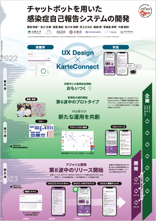 日本医療情報学会では、年に2回の大規模な学術集会を開催しており、そのうちの一つである「日本医療情報学会春季大会(シンポジウム2023)」が6/29(木)~7/1(土)にかけて開催されました。“持続可能な医療・介護の実現”をテーマに、医療・介護業界における様々な取り組みや調査報告が行われたなか、京都大学教授 黒田知宏氏の「チャットボットを用いた感染症自己報告システムの開発」と題したセッションにおいて、京都市及び京都大学医学部附属病院との共同プロジェクトとしてネオスが開発に取り組んだ「京都市新型コロナサポート ヒロメズ」(以下、ヒロメズ)が事例として紹介されました。