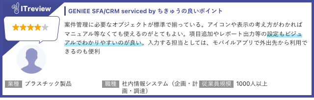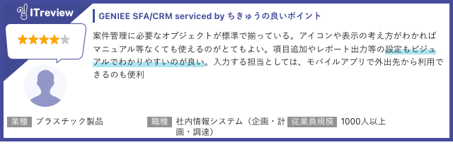 今回の「ITreview Grid Award 2026 Spring」は2026年3月までに掲載されたレビューの集計結果をもとに選定されています。「GENIEE SFA/CRM」の標準機能の充実度や、ビジュアルでわかりやすい設定画面、モバイルアプリでの外出先からの活用に関する高評価のコメントが多く寄せられました。