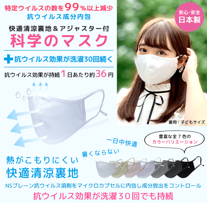 科学のマスクとは、洗濯30回続く抗ウイルス加工を約3ミクロンのマイクロカプセルに内包し、放出量をコントロールしていく効能を持つ高性能のマスクとなっております。