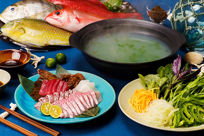 沖縄県産の水産物を使用した海鮮しゃぶしゃぶ鍋は、「星のや沖縄」と「星のや竹富島」の2施設で提供します。マグロやアカマチなどの魚や車えび、モズクを中心に、その日の水揚の様子を見ながら魚を選び、盛り合わせます。貝の出汁に泡盛を加えたスープにさっとくぐらせることで、魚介が持つ旨味が増すとともに、食感の良さを楽しむことができます。インルームダイニングのメニューとして客室へお届けするため、プライベート空間で時間を気にせずにゆっくりと堪能できます。