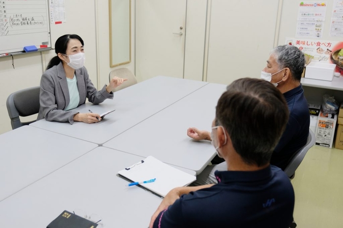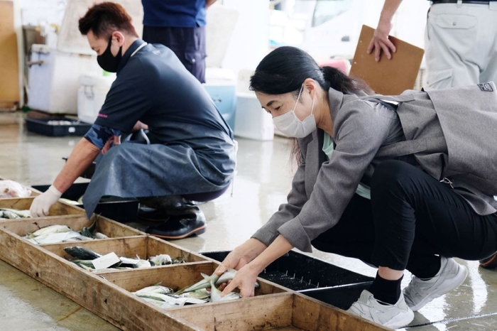 星のや沖縄の料理長である松梨智子(まつなしともこ)が、星のや沖縄から車で10分の場所にある読谷村漁業協同組合を訪れ、提供するメニューに合う水産物の打ち合わせを行いました。普段からセリに参加するために通う親しみのある場所で、沖縄の水産業の現状や、関わる方の想いに触れ、料理を通して少しでも地域に貢献できればという思いと共に、県内の方にも改めて地元の水産物の魅力を伝える機会になればと決意を新たにしています。