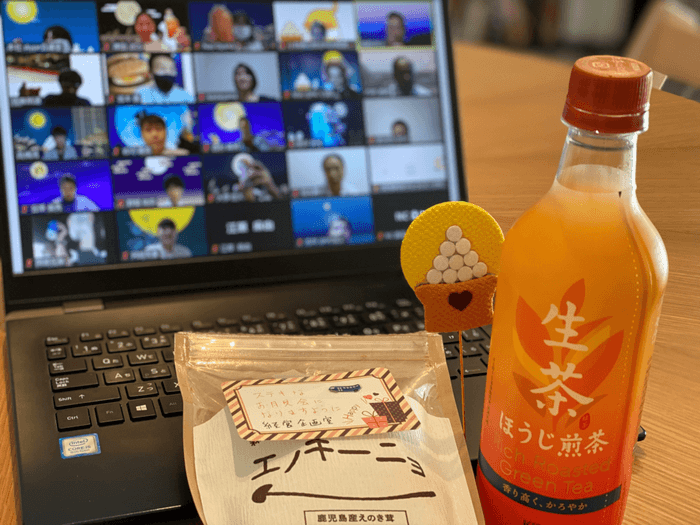 季節を感じることができるモノやお酒・おつまみなどをまとめた「お月見セット」を参加者へプレゼントし、そのお月見セットを飲食しながらZOOMでレクリエーションを行う、というイベントです。参加者は内定者と社員、合計約30名が参加しました。レクリエーションの内容は、「社員同士を知ること」を目的に、社員にまつわるクイズや、自己紹介しりとりなど、オンラインならではの内容で、社歴の長さや、世代、性別にかかわらず全社員が楽しめるコンテンツを用意しました。オンラインでありながら、同じものを食べて、同じレクリエーションをして楽しむという一体感を味わうことができました。