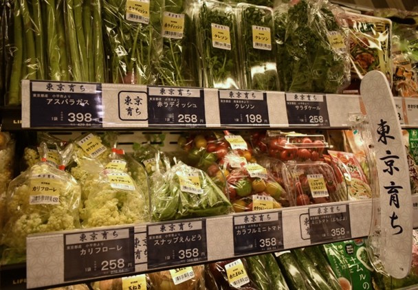 都内の農家で収穫した農作物を取りそろえたコーナー。色とりどりの新鮮な農作物を豊富に品ぞろえいたします。