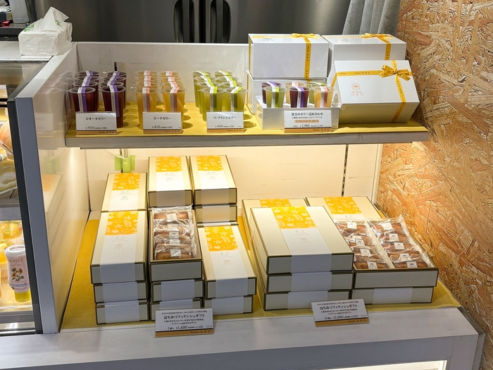 ロールケーキの他にも、手のひらサイズのカップデザートや、ロングセラーの「はちみつフィナンシェ」「果実のゼリー詰め合わせ」などをラインナップ。