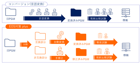 バージョンアップ後の新環境でも互換性が確保されているプログラムはそのまま温存し、非互換が確認されたプログラムのみを修正することで、プログラムの変更量を最小にします。これまでのバージョンアップ事例を活かし、OS種別やバージョン単位に分類して非互換箇所への対策方法をデータベース化しているため、高い生産性で修正作業が可能となり、低コスト、短期間でのサポート切れ対策を支援します。