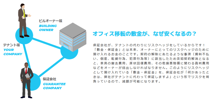 保証会社を利用することで、上記のように企業の与信に関わらず敷金(保証金)を1年間も寝かせるということが大変なベンチャー企業向けに、貸主側に預け金を削減することが可能となりました。