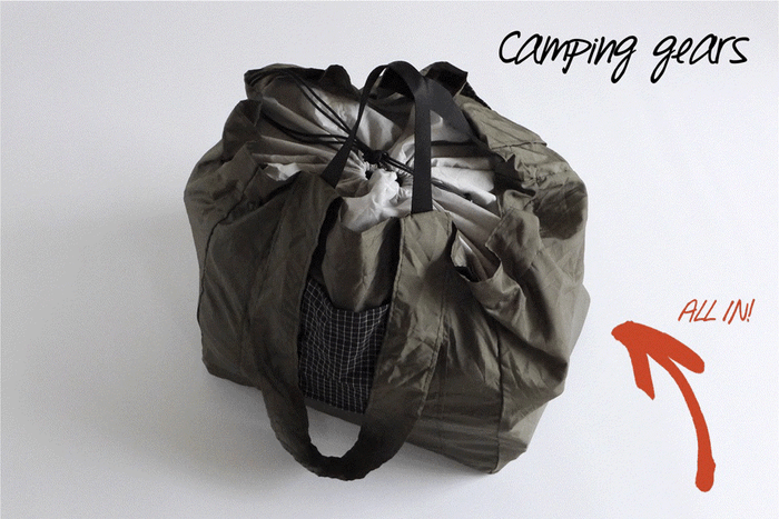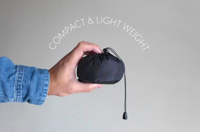 収納時はコンパクトで超軽量(130g)ですが、広げると21.6ℓの大容量トートバッグに変わります。