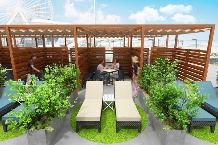 「有料レストスペース」は、事前予約で休憩スペースを確保できる新サービスです。6つのタイプから選択可能で、プールや飲食店舗に面した立地抜群のエリアや、風が心地よく落ち着いて過ごせるテラスエリアなど、ロケーションによって魅力が異なります。また、サービス、広さ、価格などもタイプごとに異なるため、お客さまのニーズに合わせてお選びいただけます。