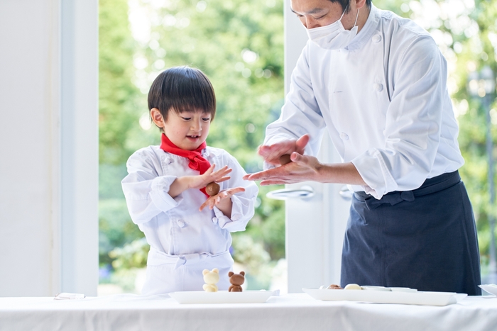 ファミリーブッフェはお子様の大好きな「ミニハンバーガーとポテトフライ」や「ツナとコーンのカップピッツァ」などをご堪能いただけます。お食事を楽しんで頂いた後はコックコートを着て、お子様がパティシエに大変身!保護者の方が見守る中で、ストリングスホテル 名古屋専属パティシエと一緒に、「ショートケーキ」づくりをしていただきます。本格的なパティシエ姿で挑戦するお菓子作り、フォトスポットでの家族写真は夏休みの思い出作りにも最適です。